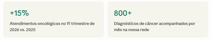 Nos últimos meses, acompanhamos de perto um aumento na demanda por cuidados oncológicos dentro da nossa rede. Só no primeiro trimestre de 2026, registramos um crescimento de aproximadamente 15% nos atendimentos ligados a diagnósticos de neoplasias, tumores e carcinomas em comparação com o mesmo período do ano anterior.