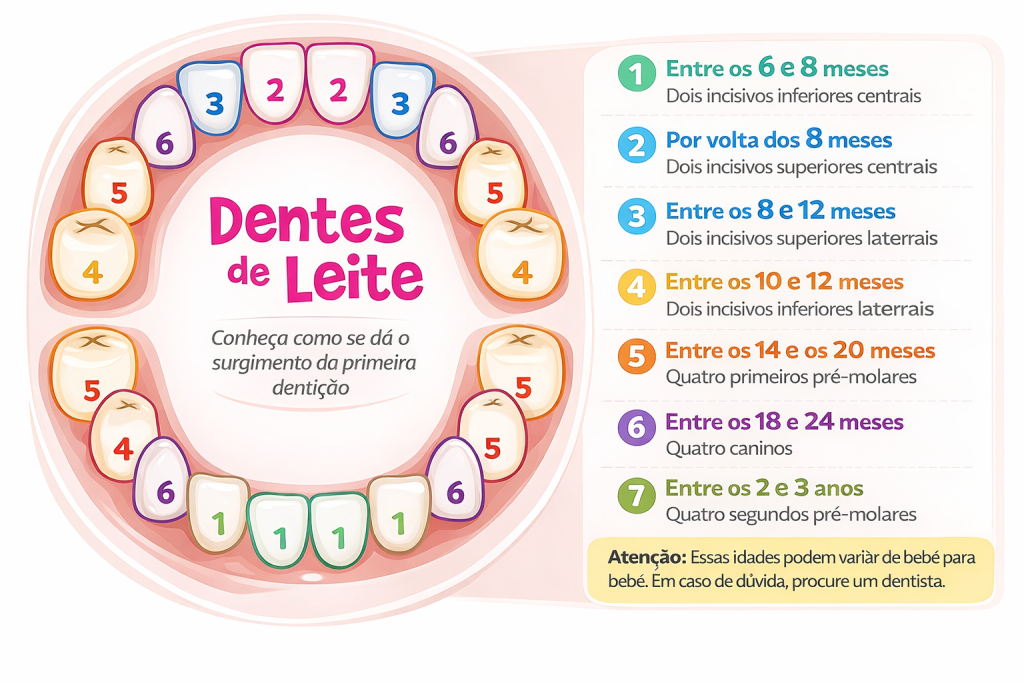 Os primeiros dentes de leite geralmente aparecem entre 6 e 8 meses, sendo o incisivo central inferior o primeiro a erupcionar.